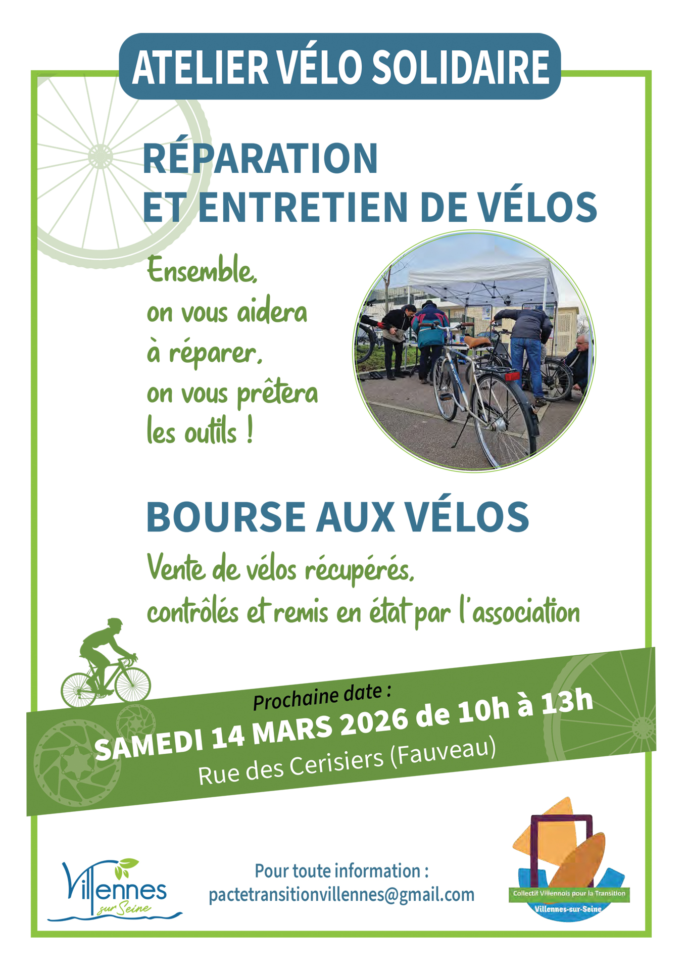 Réparation et entretien, bourses aux vélos de 10h à 12h rue des Cerisiers à côté de la place des Coquelicots (Fauveau).