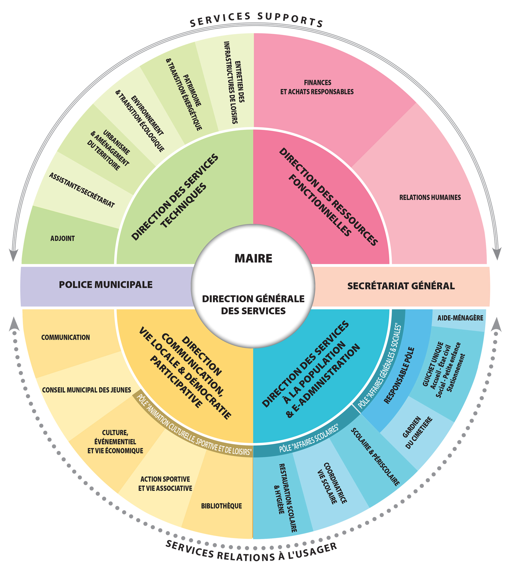 Voici l'organigramme qui régit l’organisation des services de la mairie de Villennes-sur-Seine (mise à jour 11/2025)